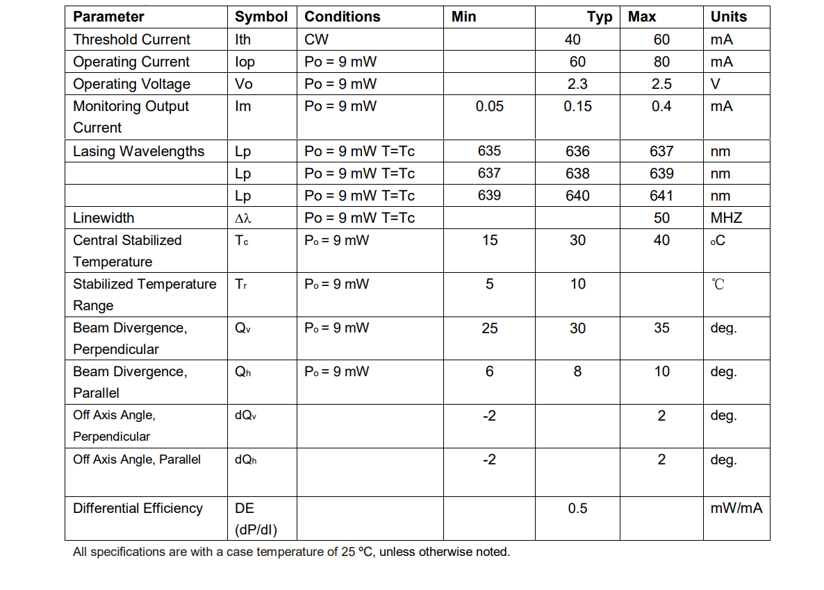 640nm Wavelength Stabilized Laser is a single mode, miniature laser in a standard TO package.